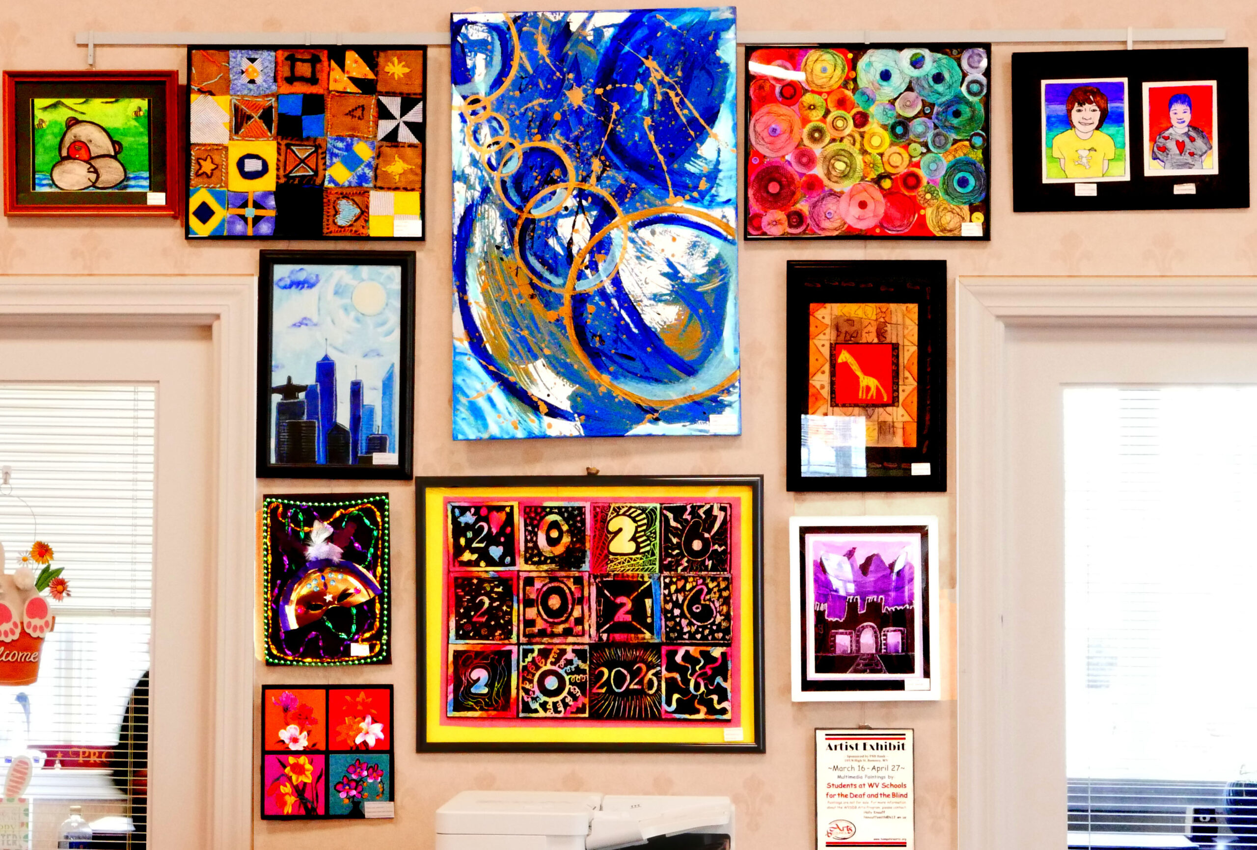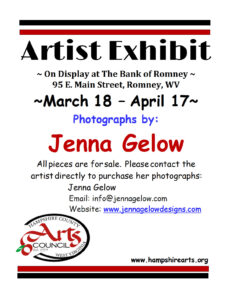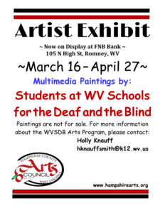 Art in Public Places Jenna Gelow Photography Location: The Bank of Romney On Display: Now until April 17 WVSDB Students Mixed Media Location: FNB Bank On Display: Now until April 27 Permanent Display: Holly Knauff & Artists Location: WVSDB Provisions Cafe On Display: Wednesdays & Thursdays, 7:30 AM – 1:00 PM